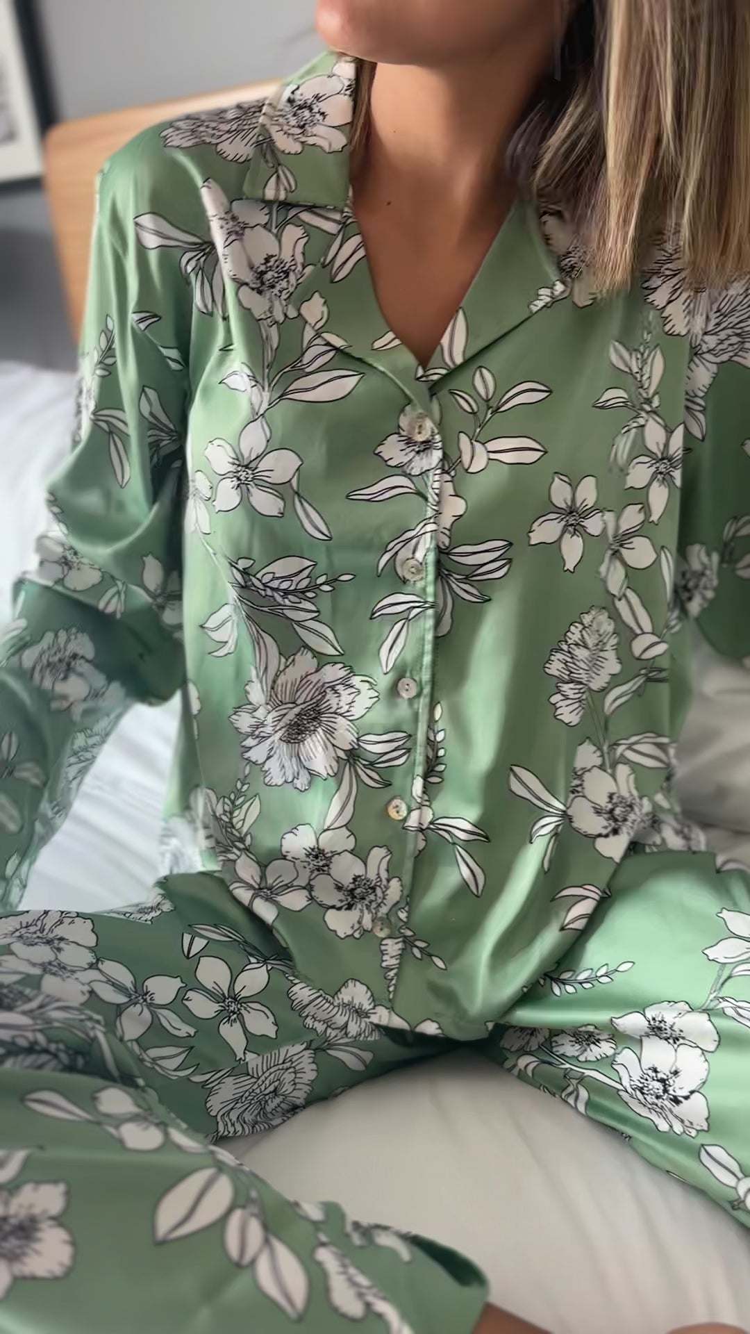 Naomi es una pijama confeccionada con seda española, una tela súper suavecita y fresca. El color de su tela está en plena tendencia y el detalle de sus flores la convetirán en tu pijama favorita este invierno.
